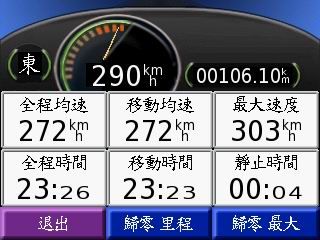 看到沒有,以299 km/hr飛在國道三號旁邊,旅程電腦更記錄了最高飆到303 km/hr,果然人民的血汗錢不是白白貪污浪費掉的!